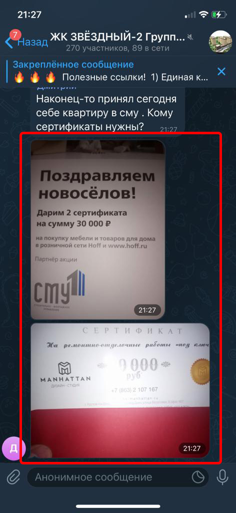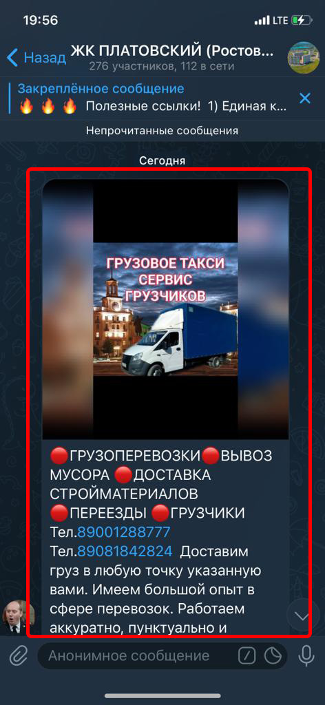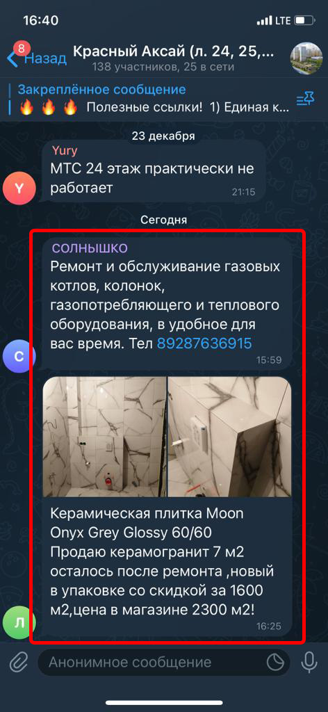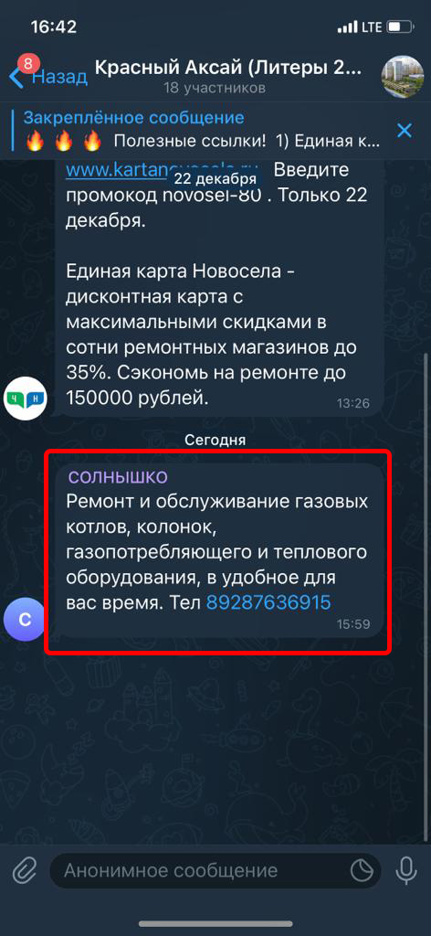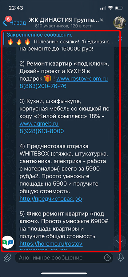 Реклама размещается в группах (чатах) жильцов в Телеграмм. Реклама закрепляется вверху каждой группы на месяц. Каждый пользователь заходя в группу постоянно видит закрепленное сообщение.
